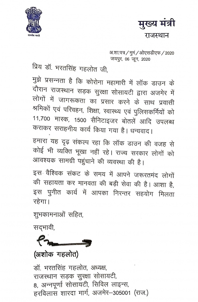 Rajasthan Sadak Suraksha Society has been serving society at large to promote road safety in the state. The projects, education and training programs and public awareness campaigns organized by the society under the able guidance of its custodians and the Chief Advisor has carved many success stories. The projects undertaken by the society such as Rajasthan Road Safety Education & Awareness Mission using road safety mobile van, the Helmet Incentive, Education, Awareness & Essentiality Campaigns have been nationwide appreciated. During the Covid-19 outbreak, the society has actively participated and served the public by distributing masks, sanitizers and medical equipment among different community groups. The efforts done by the society has also been appreciated by the Hon’ble Chief Minister of Rajasthan. The awards and recognition received by the society from the Government and other institutions are described hereunder.